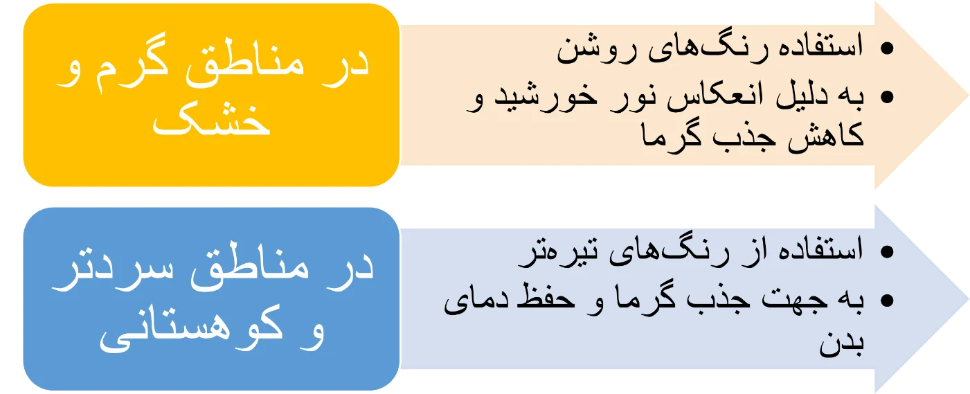 رنگهای روشن گرما را در مناطق آفتابی منعکس میکنند، در حالی که رنگهای تیرهتر گرما را در مناطق سردتر نگه میدارند. در مناطقی از ایران که دارای اقلیم گرم و آفتابی هستند، رنگهای روشن و سبک برای پوشاک غالباً انتخاب میشوند. این رنگها مانند سفید، کرم، و آبی روشن نور خورشید را بازتاب میدهند و از جذب گرما جلوگیری میکنند.