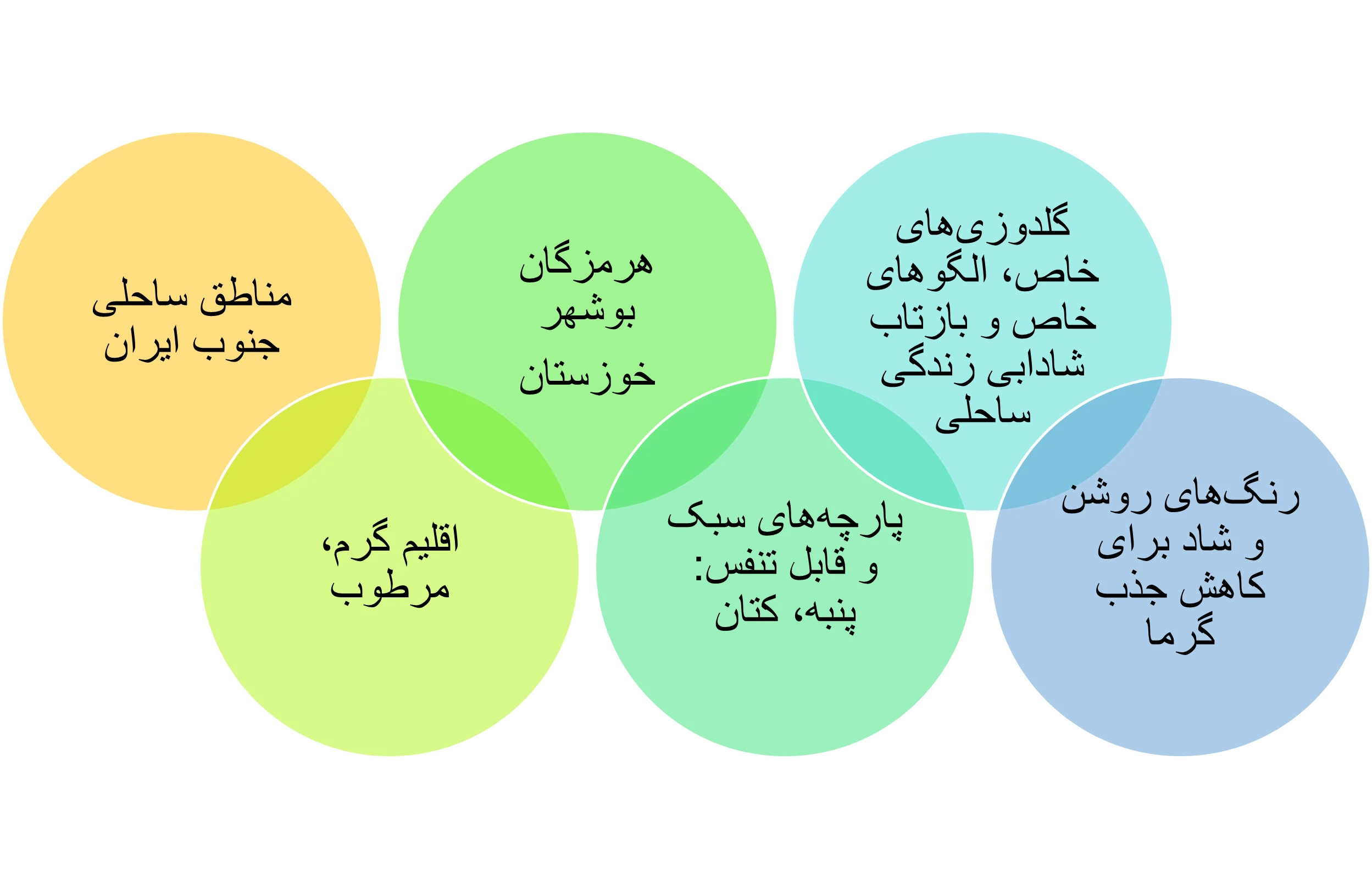 به عنوان مثال، در سواحل جنوبی ایران، مانند بندرعباس و بوشهر، مردم بهویژه در تابستانها از پوشاک روشن و خنک استفاده میکنند. این رنگها به دلیل ویژگی بازتابدهندگیشان، باعث میشوند که فرد کمتر گرما را جذب کرده و در نتیجه احساس خنکی بیشتری داشته باشد.