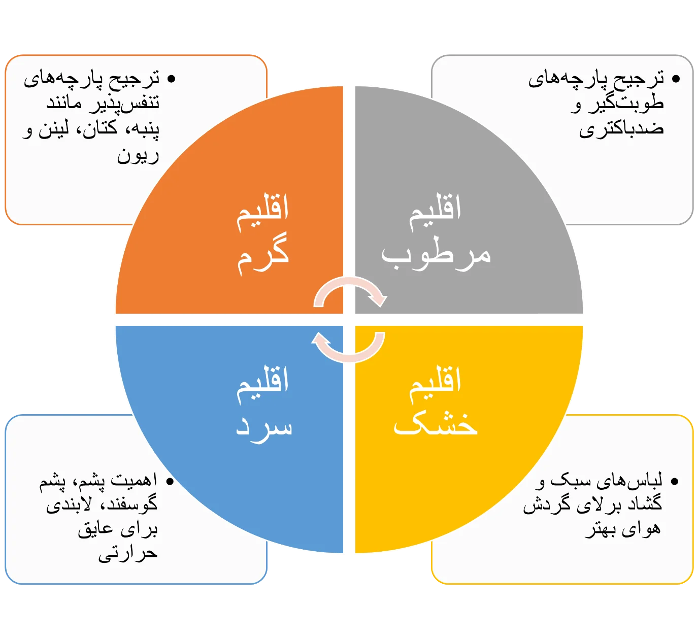 - در اقلیمهای سرد، نگرانی اصلی حفظ گرمای بدن و محافظت در برابر دماهای منفی است. پارچههایی مانند پشم و پشمگوسفند به دلیل خواص عایق خود بسیار مهم هستند. پشم بهویژه به دلیل توانایی خود در حفظ گرما و انتقال رطوبت از بدن، مناسب برای مناطق سردسیر است. این ویژگیها باعث میشود که بدن در دماهای پایین خشک و گرم بماند.